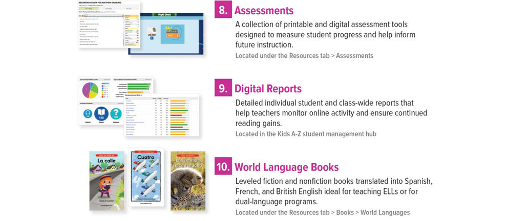Raz-Plus provides a personalized library of leveled books and additional reading passages available in printable, projectable, online, and mobile formats to each student. All online student activity is tracked in data-driven reports to help determine future